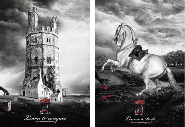 Extraordinaria la campanya del programari d'escacs Fritz, on es proposa la metàfora invertida: les peces simbòliques del joc es mostren com a personatges reals a punt de ser destruïts o assassinats per una ma negra.